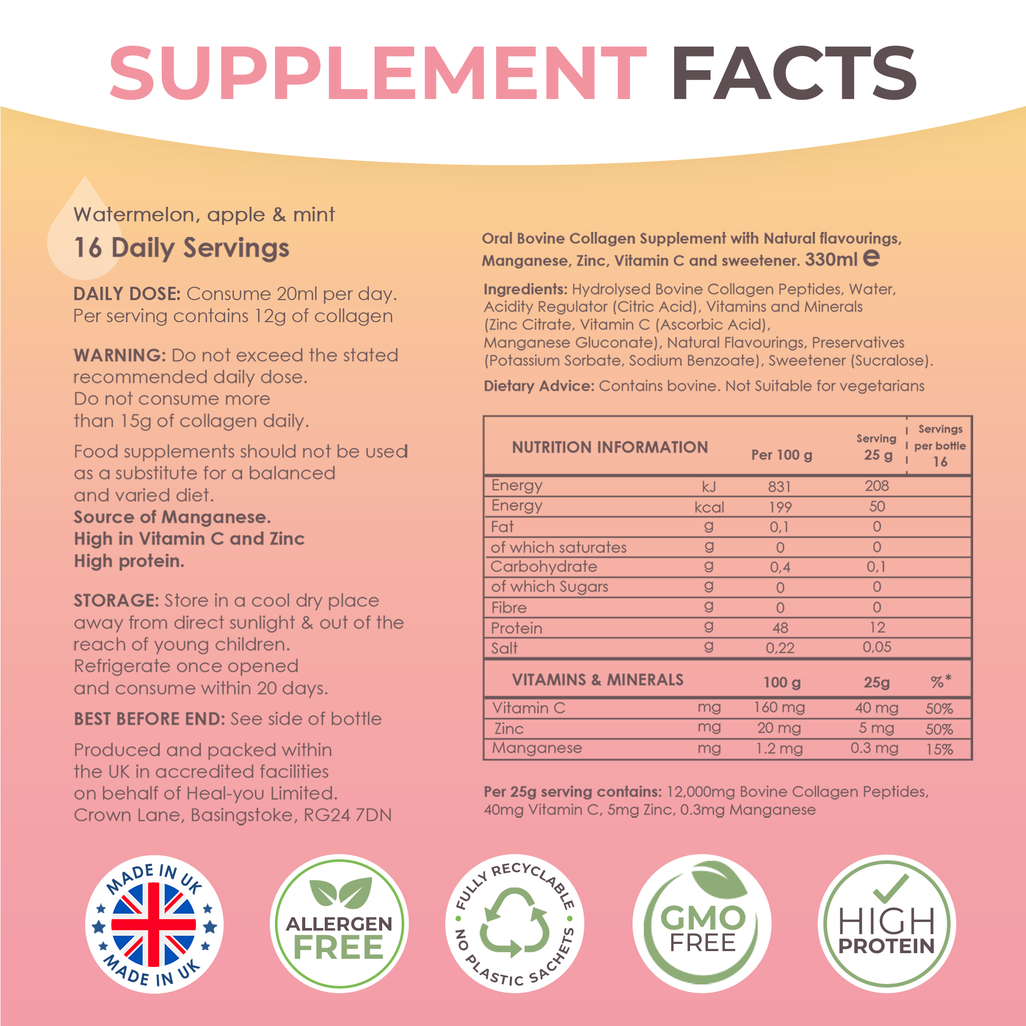High-Dose 12000mg Collagen Peptides, Bovine Hydrolysed Liquid, with added Vitamin C, Zinc & Manganese, 16 Day Supply, Made in UK